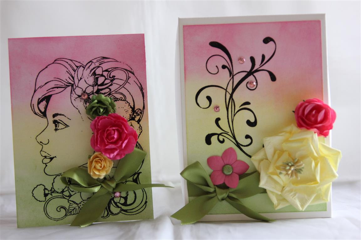 I am back from my holiday, and it was a lovely break, nice and relaxing, and still in holiday mode, so nothing much has been done here today! Todays card is a card ( on the left) and box on the right. For the card I stamped a Prima bloom stamp and heat embossed it in black embossing powder, then sponged 3 different colours of ink down the card. Added some flowers ( prima) and ribbon and bling to finish. For the lid I used a stamp from Stampin up everything Eleanor stamp set, heat embossed and ink as for the card, and added more flowers – this time Manor House, and ribbon and rhinestones as the finishing touch.Til tomorrow…..