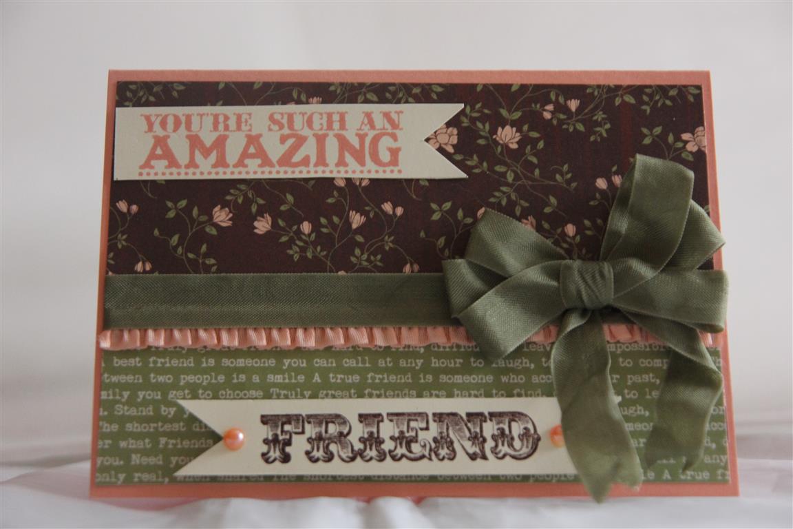IMG_2623 (Medium)The shop I teach lessons at runs a challenge every month, and this monthe challenge was ” words”. we were given a sheet of this kaisercraft paper and sent off to create working with the theme words. I came up with two cards, this is the first.Along with the paper ( I can’t remember which collection this one came from – will have to research that) I used all stampin up products – cardstock, seam binding, ruffled ribbon and sentiment stamp.I finished off with a couple of kaisercraft pearls. I was hoping I would be showing my xmas card creations using up my scraps, but due to technical difficulties of the computer sort, Nathan has been busy trying to fix my computer for most of today, so no time left to get the camera out. He seems to have succeeded, and I am grateful cos the alternative was going to have to be spend money on a new one!Til tomorrow….