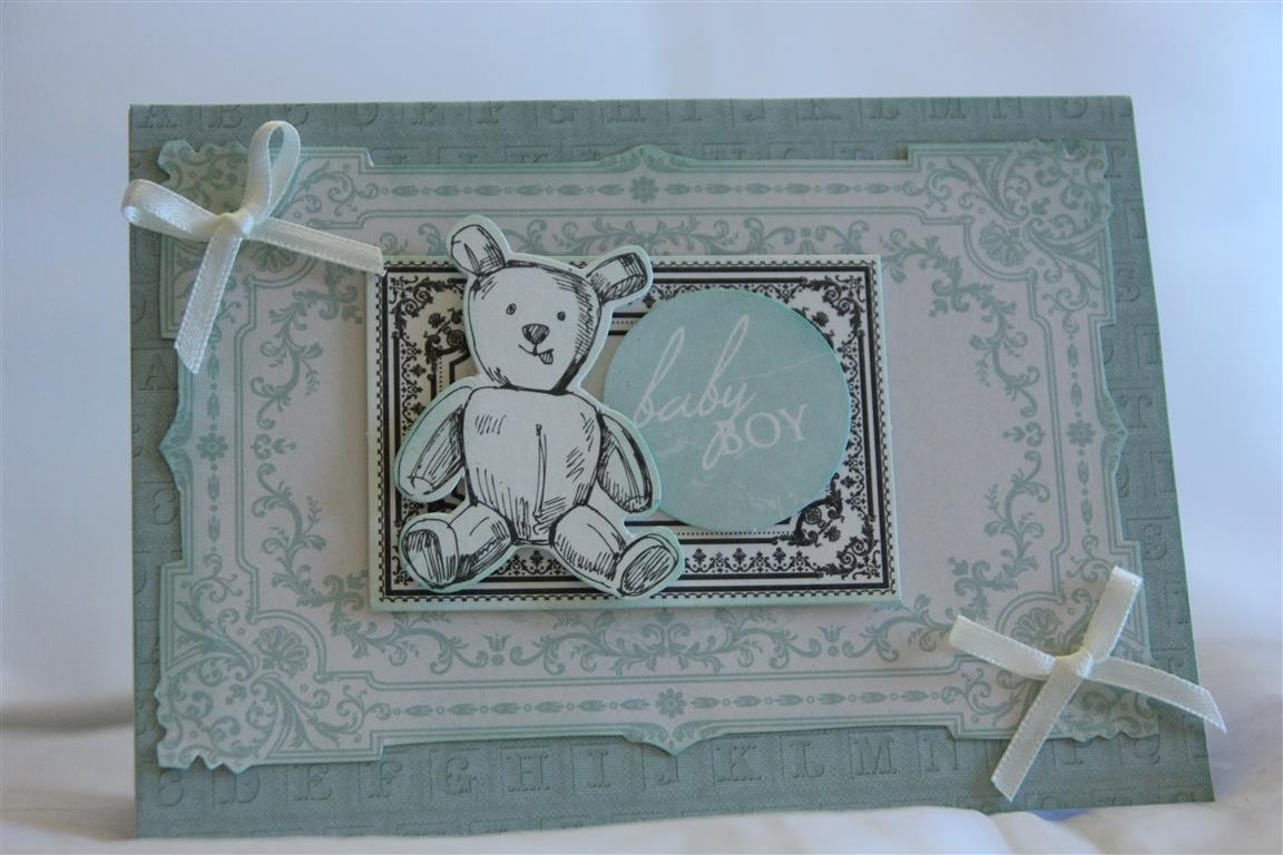 A couple of months ago kaisercraft brought out a new range of baby paper called Pitter Patter. It is gorgeous, and can be used for more than just baby cards, but I started off making a few baby boy cards with with it and this one is the first. I used a piece of patterned paper from the 6″ pad, and some of the matching collectables. I inked all my edges with Stampin up ink – Pool party, and added 2 white ribbon bows. Til tomorrow…..