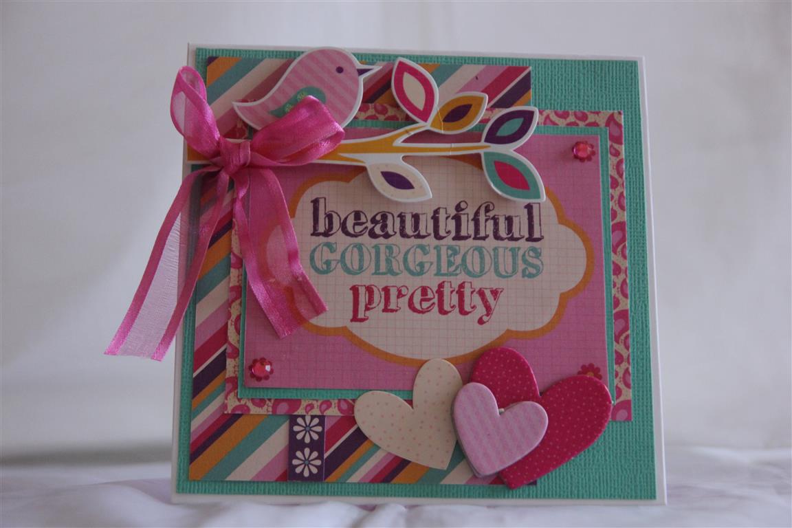 IMG_8474 (Medium)I went back though all my older paper to find something suitable for younger girls, and came across Kaisercraft Butterfly Kisses ( and matching chipboard pieces). I have an amazing amount of this so i think I have picked up a special or two as well, so I sat down and created quite a few cards from it – here is the first. The plain cardstock which I used for matting is Kaisercard. I can’t remember the name – it had mint in it somewhere,and it perfectly matches the same colour in the paper.Anyway, can’t sit here chatting – I have to get to work …. til tomorrow….