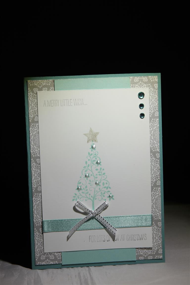 two more card today made with my new stamp set from stampin Up – Festival of Trees.The papers and cardstock I used( in fact everything I used) is from Stampin up, but it’s not strictly Christmas paper, I just thought that it would work!I like the pale blue one for a change from red and green. Today has been another good day in the craft room with quite a few more christmas cards made. Til tomorrow….