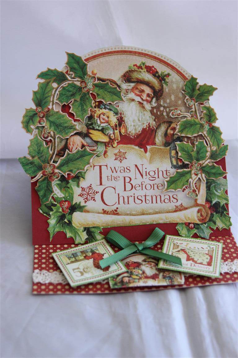 I have so many cards waiting to be shown, but we have to return to Christmas otherwise Christmas will be over! So, for a few days I will flood my blog with all things Christmas, and then we will put them all behind us for another year and move on to all the other paper collections I have been playing with! To start, Graphic 45 T’was the night before Christmas paper collection, just one tonight because I want to spend a little time explaining how I made this very simple easel card. I made a 14 x14 cm card base with some red cardstock, and just folded the front of the card into the centre fold. thats it – so easy, but the best way to showcase this image which I fussy cut from a 12 x 12 paper from the collection. I did a little more fussy cutting to make the front stoppers, and the holly frame,covered the base with more patterned paper,and added a strip of lace, bow,and kindyglitz.Til tomorrow….