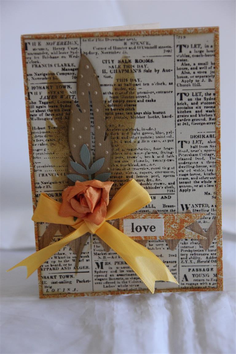 The paper I used here is Tropical Punch by Kaisercraft, and the Die is also by kaisercraft. I die cut the feather and ran it through the cuttlebug swiss dots folder. I used the off cut from the feather die to sponge through to create the inked images on the patterned paper.( tea Dye distress ink).A flower, punched leaf,and bir ribbon bow and this one was complete! Til tomorrow…