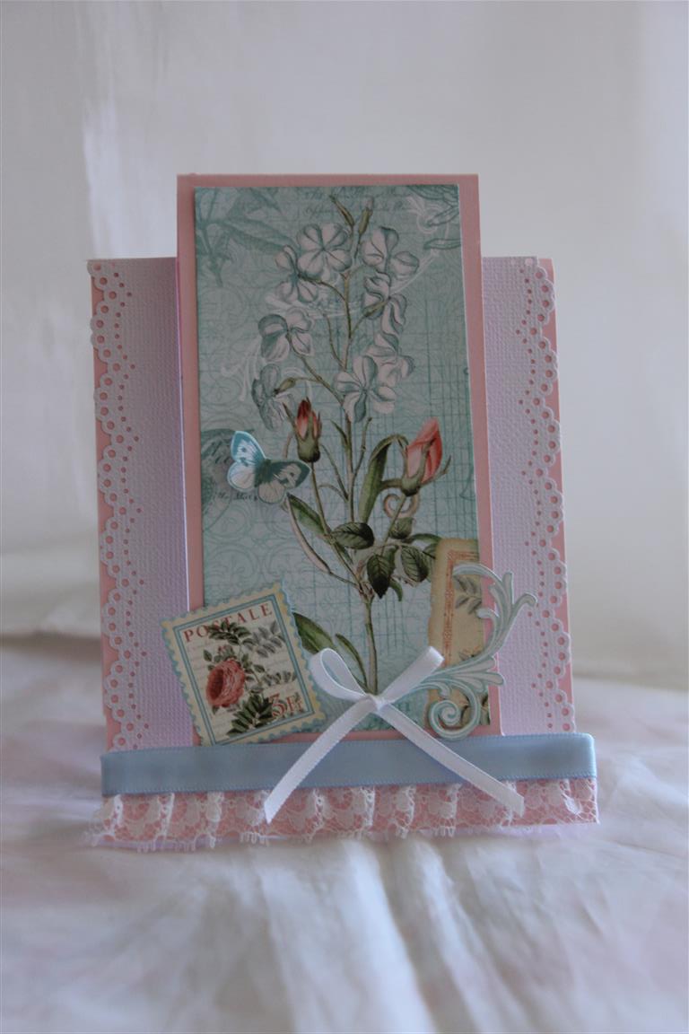 Here is the last card i made with Graphic 45 time to flourish June papers. I have used every scrap of these few sheets, which doesn’t happen very often!. this card was another experiment with measurements for the stepper cards, an awkward size for envelopes, this one, so I had to get my envelope maker out to make one for this.a little fussy cutting, ribbon and lace,and it did become the inspiration for one of my classes in February, so really I haven’t seen the last of this gorgeous paper!Til tomorrow….