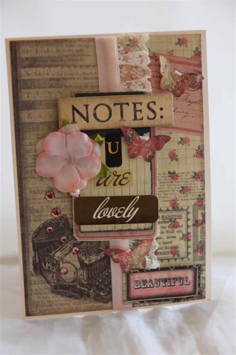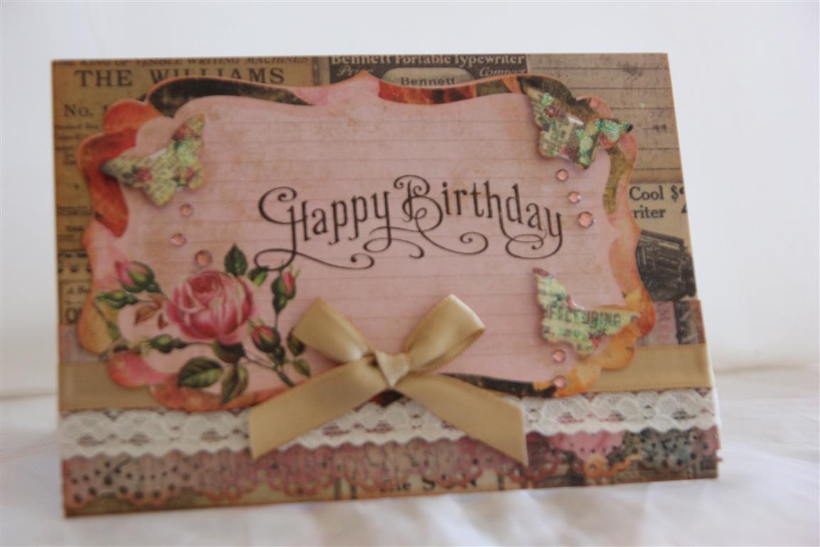 IMG_5749 (Medium)IMG_5750 (Medium)So, the very first collection of papers I took out to sort through was Prima tea Thyme. I didn’t get very far in the sorting out, but got streets ahead in the card making, and none of this paper made it into the discard pile!The top card had so much embellishing including…ribbon,lace,punched butterflies,rhinestones,kindyglitz,letter stickers, chipboard,and a flower. The bottom card escaped most of my over the top embellishing and just had a journalling card from the same collection,punched butterflies, ribbon ,lace and rhinestones.A few more to show in this collections but we will do them over the next day or two in groups of two or three. this morning I taught a class over at Paper Flourish, and as usual enjoyed my time spent with my ladies,who are much more like friends than students! Til tomorrow….