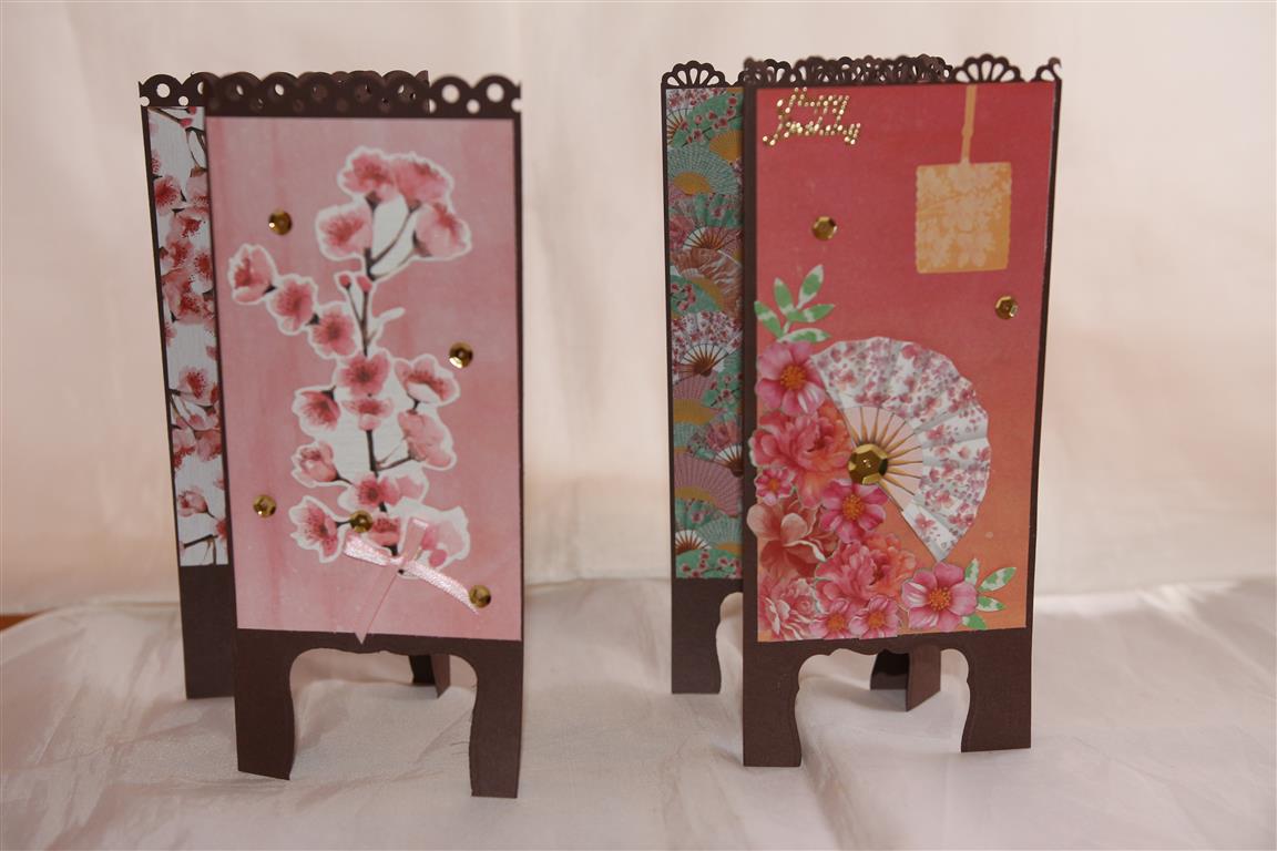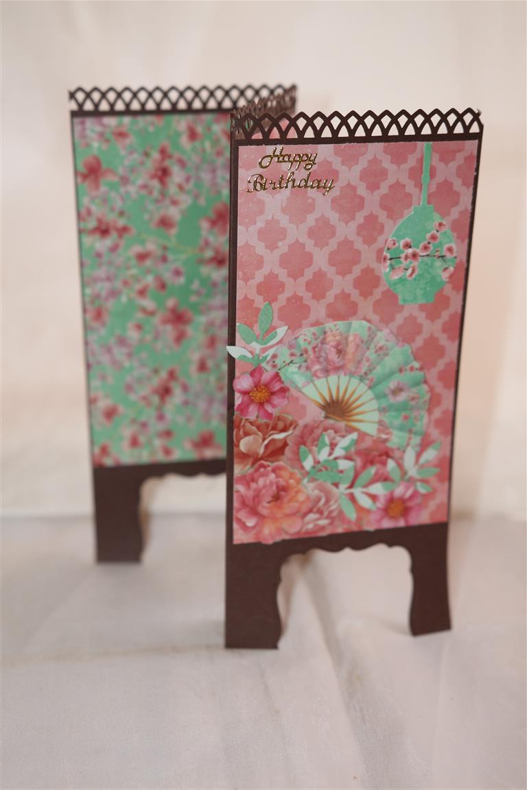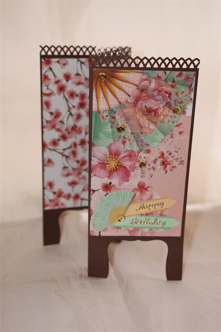 The last few cards I made with Kaisercraft Cherry Blossom paper collection ( and matching collectables) were these ..lets call them screen cards!I used an a4 piece of cardstock, punched a border along one long edge, folded it into 3 equal panels, used a spellbinders label die on the bottom to mimic legs, and decorated!I had to do it because the paper reminded me so much of those chinese dressing screens you see.thank you all so much for your kind comments about my craft room. it’s a delight to sit in there now, and every now and again I tackle the little pockets of bits still remaining so by the time I go back to work next week it should be completely overhauled!Til tomorrow….