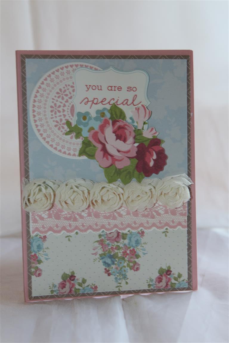 This months Kaisercraft release of Secret Garden is absolutely gorgeous, and I couldn’t help myself – I bought the 6″pad, all the 12 x 12 papers and 2 packets of the collectables. It has been a great distraction when I have been meant to be cleaning out the craft room! I have had to force myself to pack it away for now, but not before I made a multitude of cards. We will split this group into 2 or 3 otherwise you will all be sick of seeing them all! This is the first one – Stampin Up blushing bride cardstock,layers of papers from the pad and a few collectables. the flower trim is also from stampin up. the collectable flowers wre hiding the words “to me’ on the label which I didn’t want on this card. There’s a handy hint – flowers can hi9de a multitude of errors!Til tomorrow….