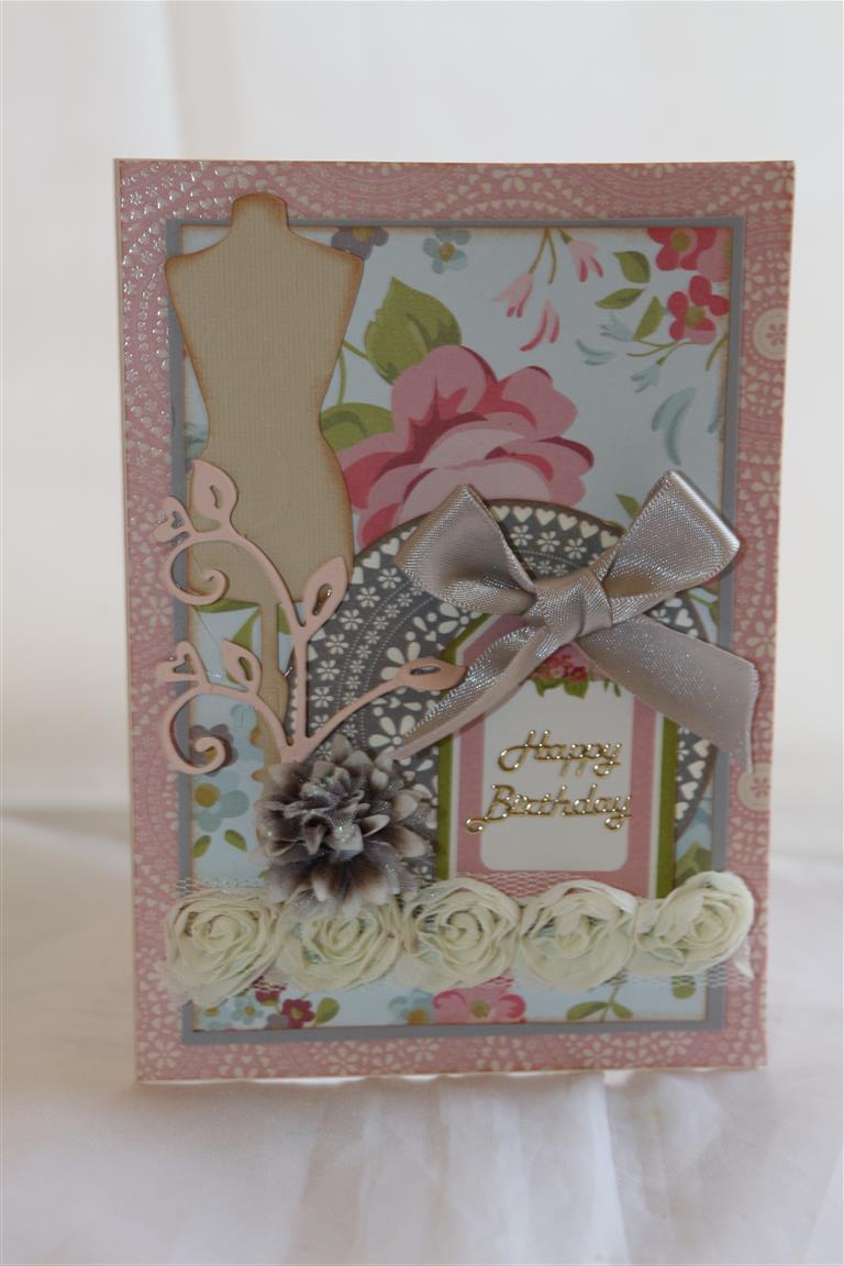 Kaisercraft secret garden 6″ pad for the layering, and to embellish – dies Magnolia flourish, kaisercraft dress form, ribbon,prima flower, stampin up trim, and collectables from the secret garden collection.Today I am off work, having a scan done to determine the source of my hip pain, so I am off now to relax a bit in the craft room – til tomorrow…