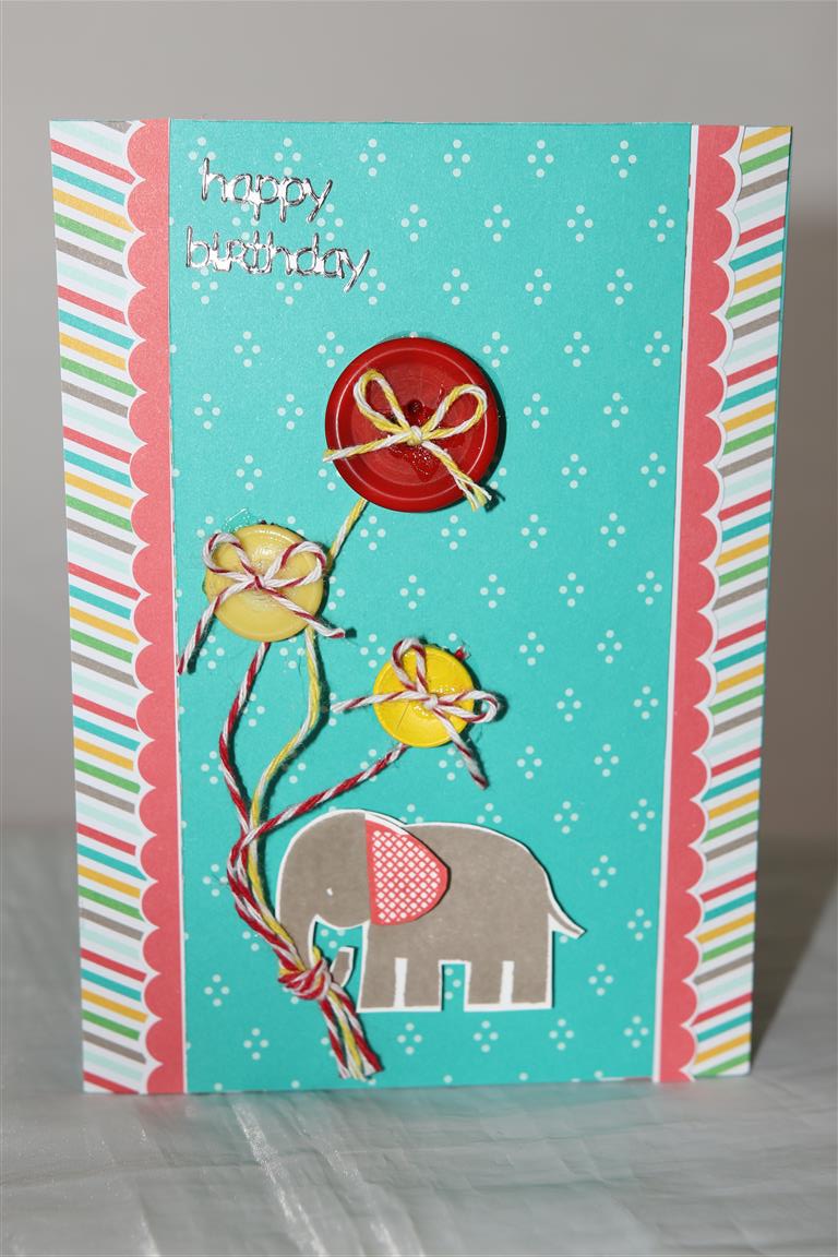 IMG_5146 (Medium)I showed a card similar to this that I made for my great nephews 1st birthday, and while I had everything out I whipped up another one to put in my box. For this one I substituted the die cut balloon for big bold buttons and lots of bakers twine. The paper is Stampin up cherry on Top, I fussy cut the scallops down the side, and the Elephant is a stamp from stampin Up Zoo babies set. I taught a class this morning, lovely group of ladies, and while there I picked up a new Kaiser die ( well 3 but this one in particular) – it was the poinsetta die, so I can’t wait to start creating with it. Sometimes it just takes something new to get you into the Christmas spirit!! til tomorrow….