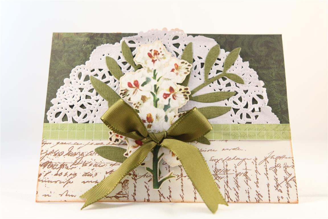 Happy 1st of spring day ( or Autumn day if you are a visitor from the northern hemisphere). the weather here is glorious… my kind of weather, not too hot, sun shining, I can feel my bones thawing out! todays card is made with Kaisercraft botanica collection – the 12 x 12 papers, and I fussy cut the flower stem from some of the paper. Added a doily, ribbon bow and inked all the edges with tea dye ink. This one was a class card,as were the previous two shown. well, time for work, til tomorrow….