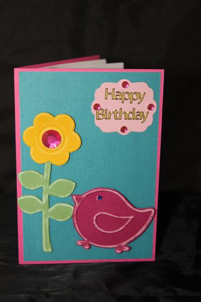 Here is another one of those cards that I really enjoyed making – This little bird looks so happy! I used Stampin Up cardstock – Pink Passion, Core’dination cardstock, Sizzix embossing folders, and the greeting tag was a Stampin up Die. I am doing a few 3d cards tonight for my boxes, and then a couple of xmas cards. I have set myself a challenge – I haven’t got out my xmas stuff yet, I only have a Kaisercraft 6″ paper pad – Be Merry – so I am now determined to see how many cards I can make just using that one paper pad and a bit of cardstock ( and kindyglitz of course).So far I am up to 8! Til tomorrow….