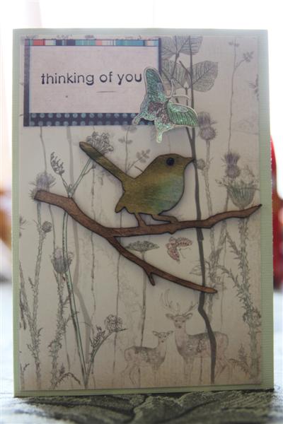Tonights card uses Bazzill cardstock as the base, and Kaisercraft Secret Bird Society 6″ paper pad,and Kaisercraft wood flourishes – Birds. I inked the bird with Tim Holtz distress inks, and used a Stampin Up greeting stamp. The little butterfly was fussy cut out of the patterned paper.I really like this paper, and haven’t done nearly enough with it – maybe after xmas! I will sit and make a couple of cards tonight but I have bought a couple of new books ( A new Jeffrey Deaver – yay!!) so will be reading tonight! Â Til tomorrow….