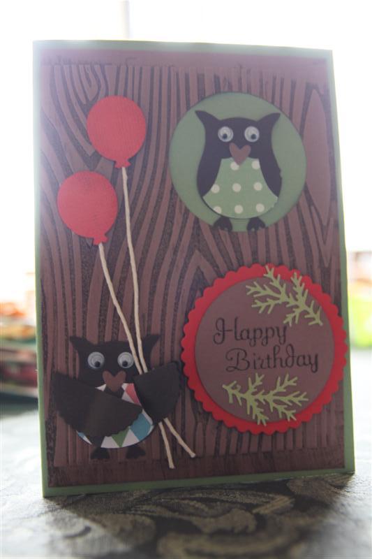 Finally I have had time to play with my owl punch. There are many variations of this card on blogs throughout the land, and this is my take, although I have noticed that my little owl holding the balloons has a wing problem. That half circle was folded back to make a quarter circle for his wing, but he appears to have had a mishap in the photographing process.I used Wild wasabi ,close to cocoa and poppy parade stampin up cardstock,and a cuttlebug woodgrain folder which I inked with choc chip stampin up inkpad. I used various other punches and circle dies, some string and wobbly eyes to finish. I must go and pack my bag for tomorrows class, so til tomorrow…..