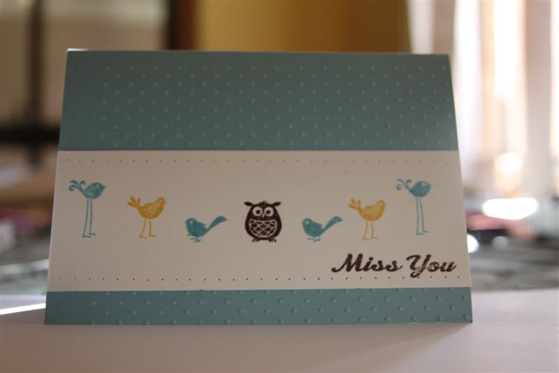 Todays card is almost a direct copy of a card in the Stampin Up Ideas catalogue. I used Stampin Up cardstock – Baja Breeze, and very Vanilla, the Avairy stamp set, and asorted inkpads. I also used the cuttlebug swiss dots folder, and an old miss you stamp I had in my craft supply. Don’t you love the look on the owls face? He looks totally out of his depth amongst those fancy little birds! Til tomorrow…..