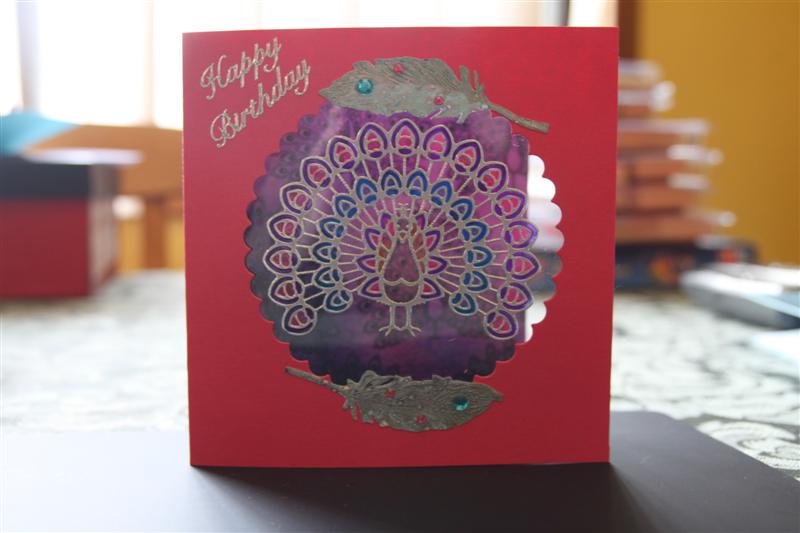 Hi, its been a busy couple of days, but I have finally got some time to sit and create, so the dining table is covered with papers and stamps, and my mind is busy ticking over. I saw a beautiful card on Kays site (link on the right) from her friend Judith, and I am going to pinch a couple of her ideas to make my cards tonight. But for now I want to show you a card that I made intending to give to Kay for her birthday, but ended up giving her a different one. This one will be kept for my other sisters birthday in October.I used stampin up cardstock – melon mambo – Die cut a circle in the front, and attached a window of acetate. I stuck on an outline sticker of a peacock and coloured it with sakura aqualip pens. I stamped a couple of feathers from stampin ups Natures Nest and silver embossed them, cut them out and attached them to the front .A bit of bling and Done!