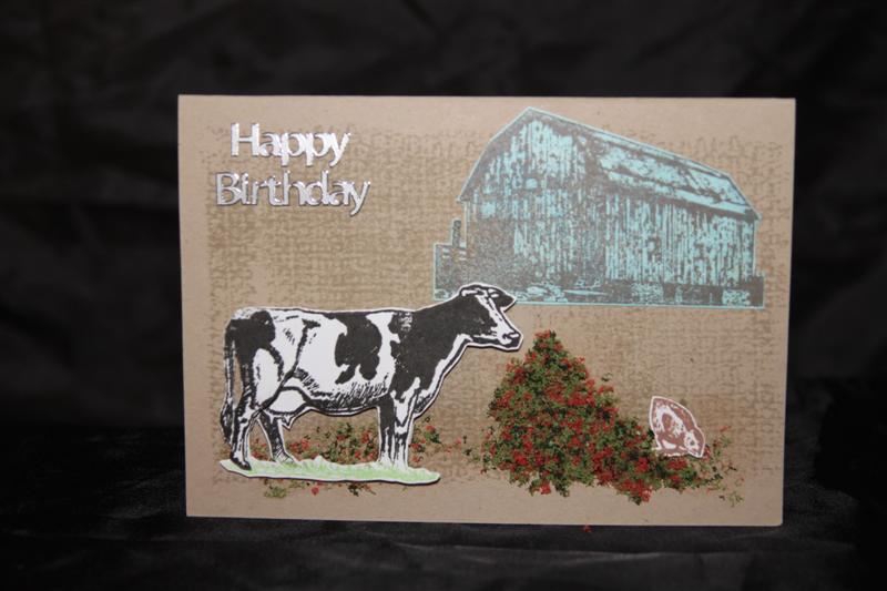 I received my new stamp sets in the mail the other day from Oxford Impressions in America. Great excitement! And what fun I have had playing with them. The stamps I used on this card are from the Farm boy stamp set. There is an amazing amount of stamps in this set, and on this card I have used 4 of them.I used stampin up Kraft cardstock, although I believe it has a new name now – I’ll just check – yes crumb cake – I’ll have to get used to that,then stamped a hessian background, stamped the barn onto some blue scrap patterned paper, the cow and the little chick onto white cardstock . I created some bushes by using some flowersoft. The inkpads were all stampin up – close to cocoa, sahaha sand, certainly celery and black. I had great fun creating this card, I love making cards that you can make up a whole story around, and usually as I am making them I have a narration going on in my head about what is happening in cardland! Thats it – now you all know I’m mad!Til tomorrow….