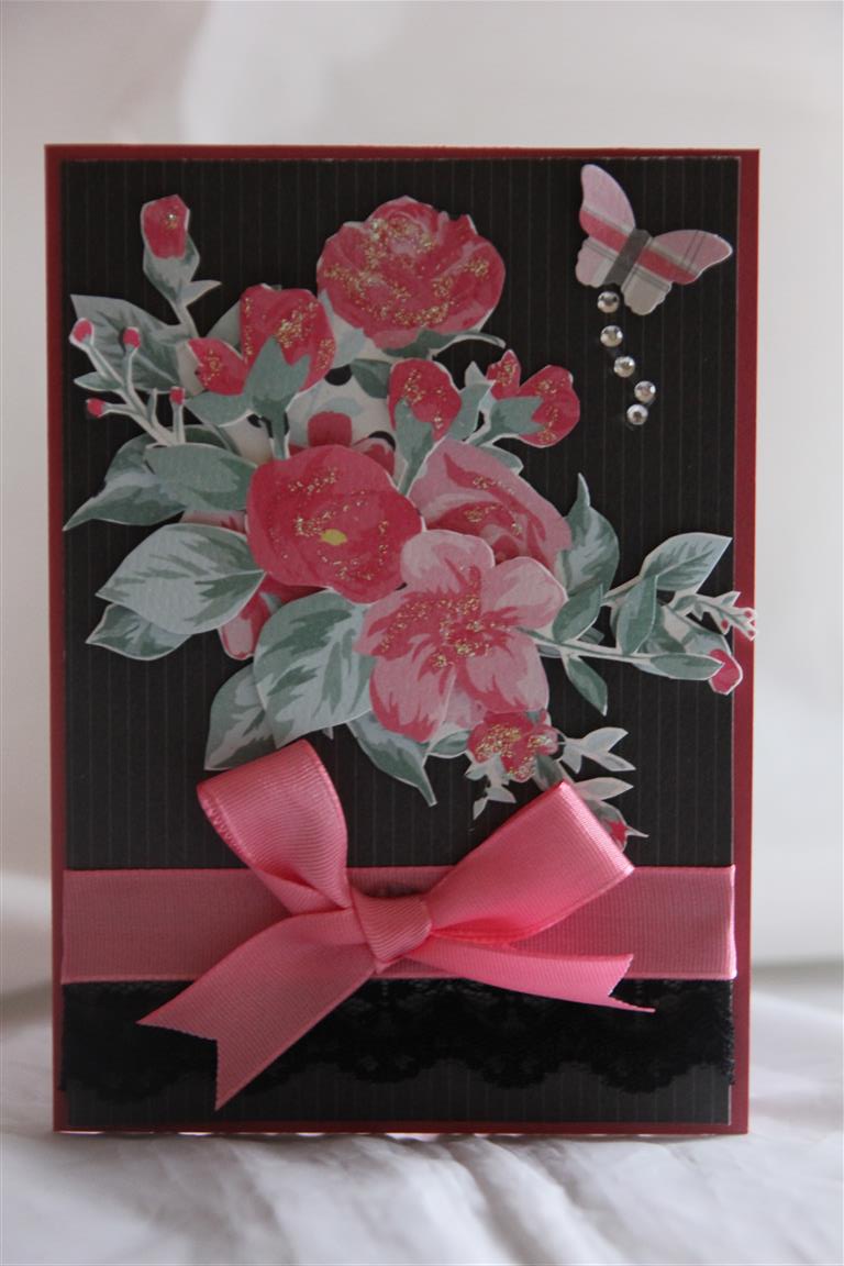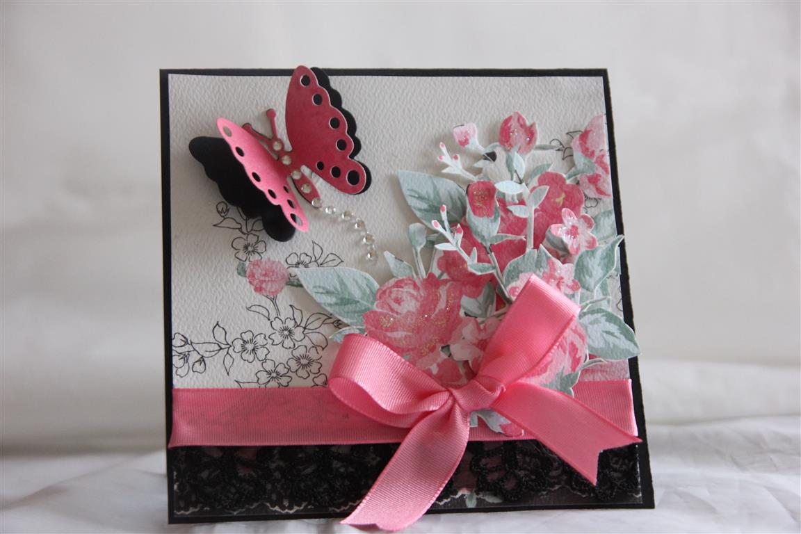 I bought a few sheets of this patterned paper by Athentique. The range is called Pretty, and yes, it is! I fussy cut the flowers from one sheet,and i have used some of them on this card. I have used some stampin up cardstock, used another piece of paper for the background, and added some black lace, gorgeous satin pink ribbon, and kindyglitz on the flowers. the butterfly was punched with a Martha Stewart punch, and I added a bit of a rhinestone strip.Til tomorrow…..
