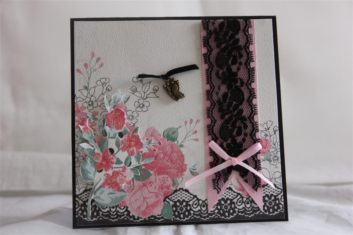 Authentique Pretty paper collection, mounted onto black cardstock base. I cut a matching strip for the right hand side, and layered a piece of lace onto it, mimicking the cuts at the bottom, and added a little pink bow . On the left I mounted some of the fussy cut paper, and added a butterfly charm threaded with black ribbon. Today i have prepared my september lessons, and have been thinking about christmas cards. I have a day off on Monday,. so will pull out last years left over paper and make a start on using it up so that I don’t feel too guilty when I buy new releases which I know are on the way and I won’t be able to resist! Til tomorrow….
