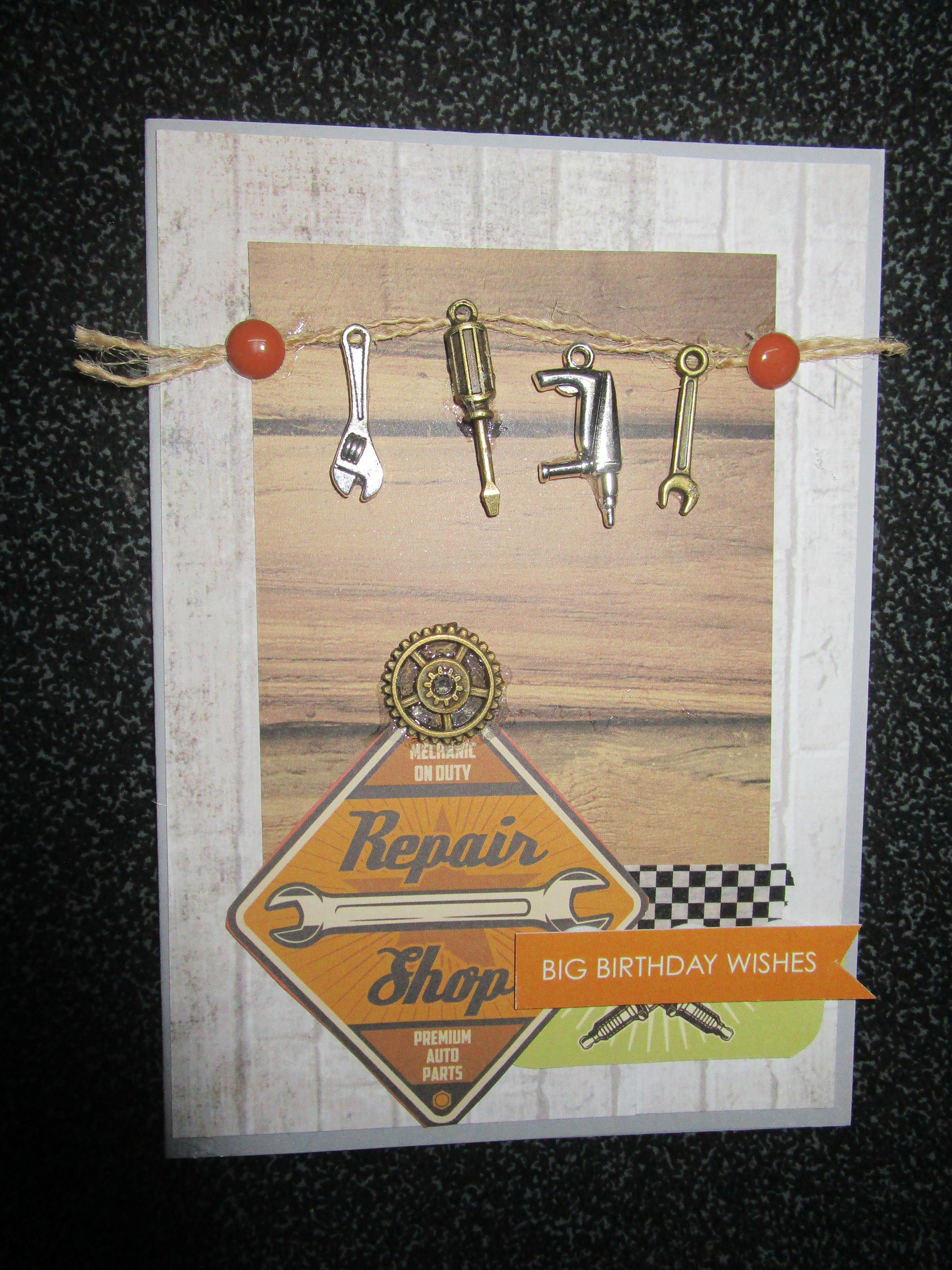 _MG_4642 (Medium)The final male card in this group is a die cut one. I used Paper Rose Tool set die and Pegboard die and Kaisercraft Occasions die for the sentiment. The patterned paper is a scrap of woodgrain paper. I die cut the tools and sentiment from some silver cardstock, and distressed and inked the edges of the woodgrain paper. The next series will be Graphic 45 Portrait of a lady, because I know some of you are waiting to see what I have done with that collection!Til tomorrow….