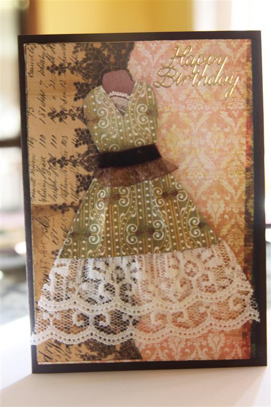Here is a card I made a couple of weeks ago, after I bought some Collection element chipboard pieces that were in the shape of a dressmakers dummy. I shaped the top of the dress to the chipboard, and crease folded the skirt. The papers used were Basic grey Curio, and I added lots of lace, just cos I love using it! Til tomorrow…..