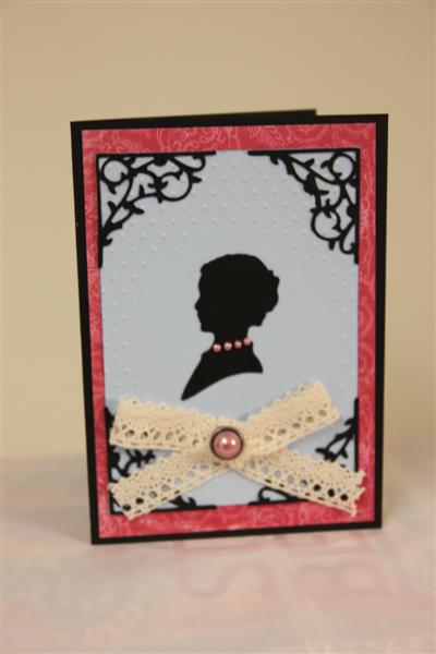 I made this card after trying the technique I mentioned a few posts down using my cuttlebug and the swiss dots folder. I managed to only emboss the border of the cardstock, leaving a circle in the centre unembossed. I cut the swirls and cameo with my cricut, and added lace and a brad from My Minds Eye – Lost and Found. There are 35 gorgeous brads in this one packet – a bargain!The cardstock is Stampin Up Bashful blue and basic black, and I can’t for the life of me remember what the paper is – I blame the extreme heat! Til tomorrow…..