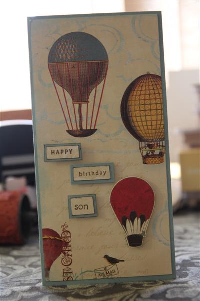 Finally I have had time to play with my owl punch. There are many variations of this card on blogs throughout the land, and this is my take, although I have noticed that my little owl holding the balloons has a wing problem. That half circle was folded back to make a quarter circle for his wing, but he appears to have had a mishap in the photographing process.I used Wild wasabi ,close to cocoa and poppy parade stampin up cardstock,and a cuttlebug woodgrain folder which I inked with choc chip stampin up inkpad. I used various other punches and circle dies, some string and wobbly eyes to finish. I must go and pack my bag for tomorrows class, so til tomorrow…..