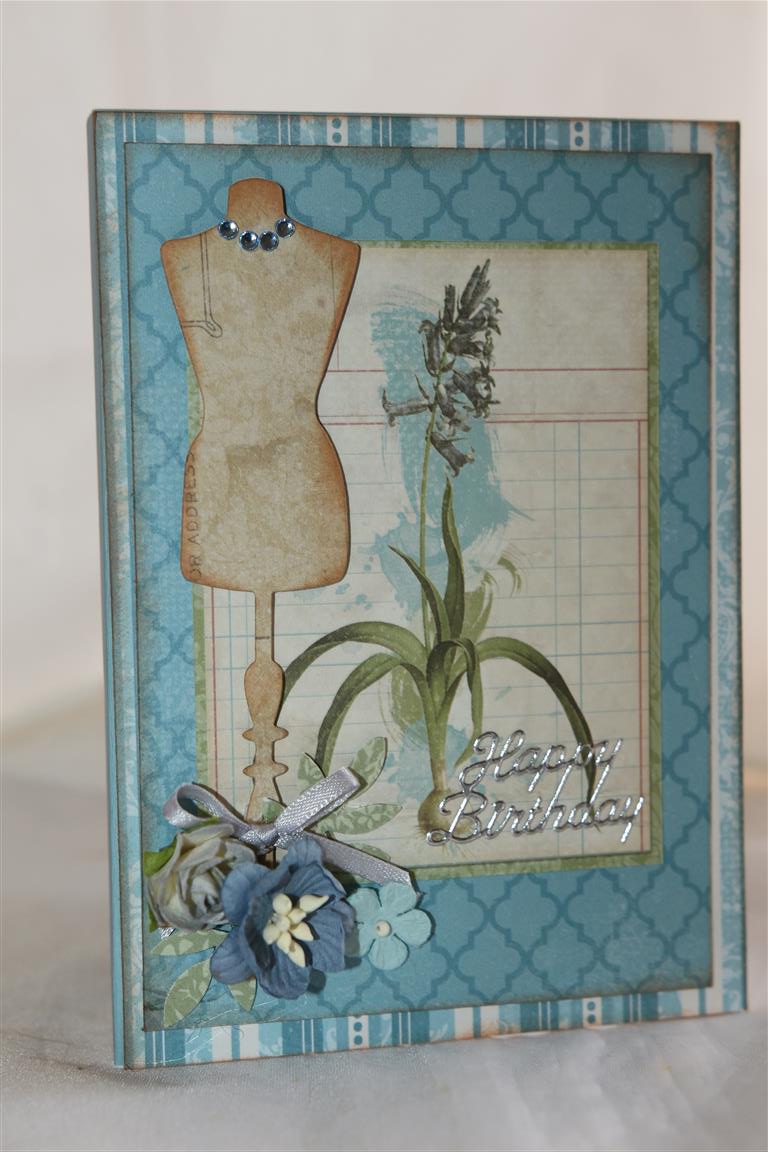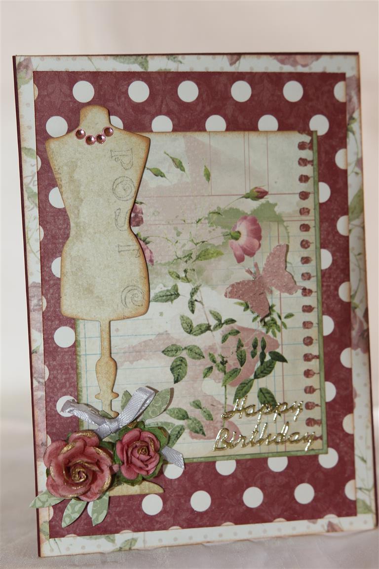Two more cards made with Bo Bunny Garden Journal paper collection, and these ones have a distinct vintage style. Loved using lace,pleated ribbon ( stampin up) assorted flowers and some punched leaves and border trims on these ones. The dress form is a kaisercraft die,and I inked around all my edges with tea dye distress ink.Today will be a day of finishing off projects on my craft table I think, as long as I don’t get too disracted! til tomorrow…..