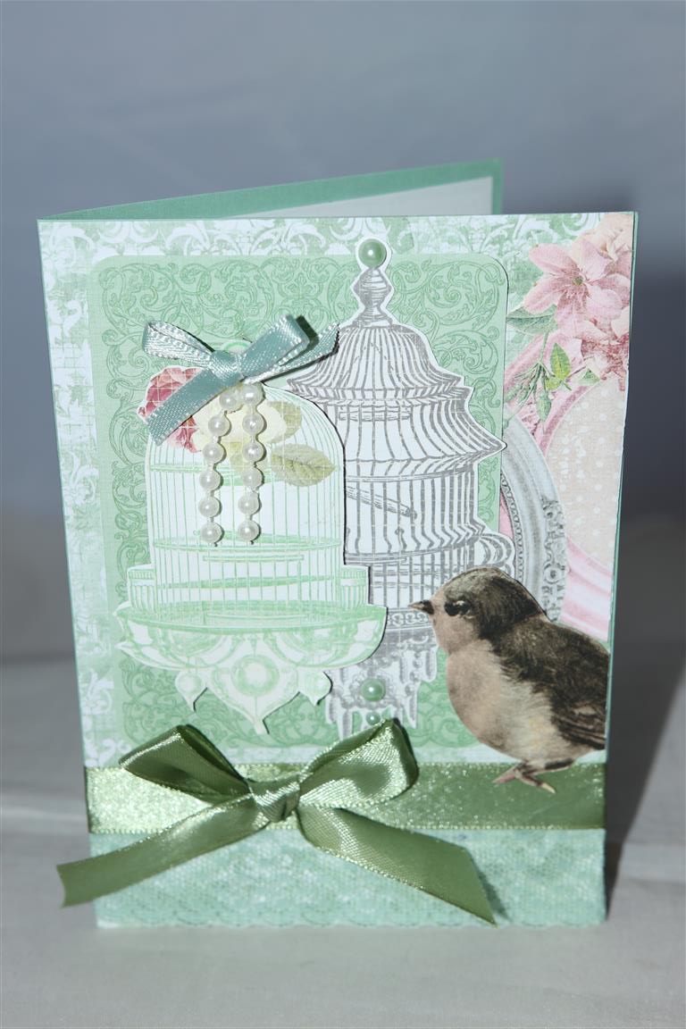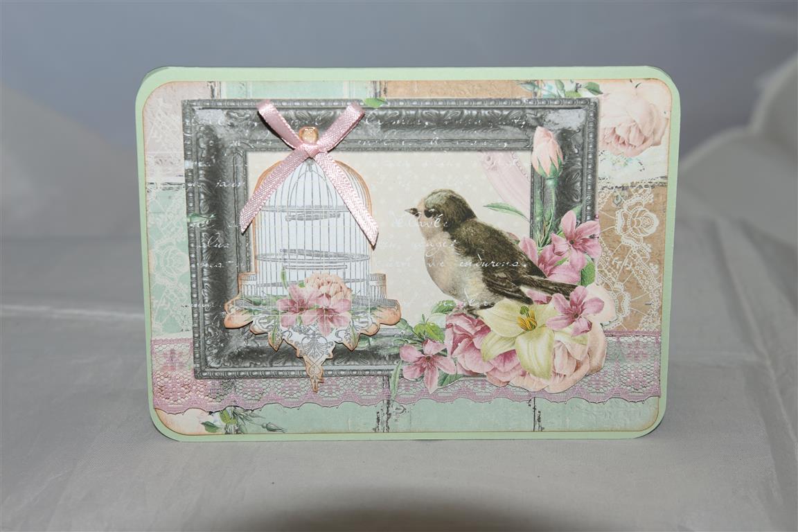 For this one I rounded all my corners, inked all my edges and fussy cut one fo the frames from a piece of the paper from the Bo Bunny Madeleleine collection as well as the bird cage and bird. I ran a piece of lace around the bottom of the card and tied a ribbon into a bow for the top of the cage. all good intentions to spend the evening in the card room while everyone is out tonight, but it is really cold through there so it might be an evening in front of the tv and heater! til tomorrow….