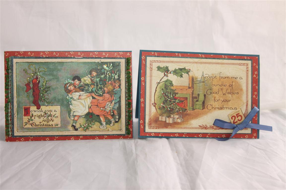 Although I have titled these cards Graphic 45 Christmas Emporium, I think a little bit of graphic 45 Christmas Past from the previous year has crept into these ones – just goes to show – never throw away those scraps! also explains why I cant move in my craft room at the moment. The time is coming for a ruthless clean up. These cards are self explanitory, a bit of fussy cutting of the images, some layering and bakers twine and ribbon added for texture and interest.I also see I used an ek success border punch on the card on the right. Til tomorrow….