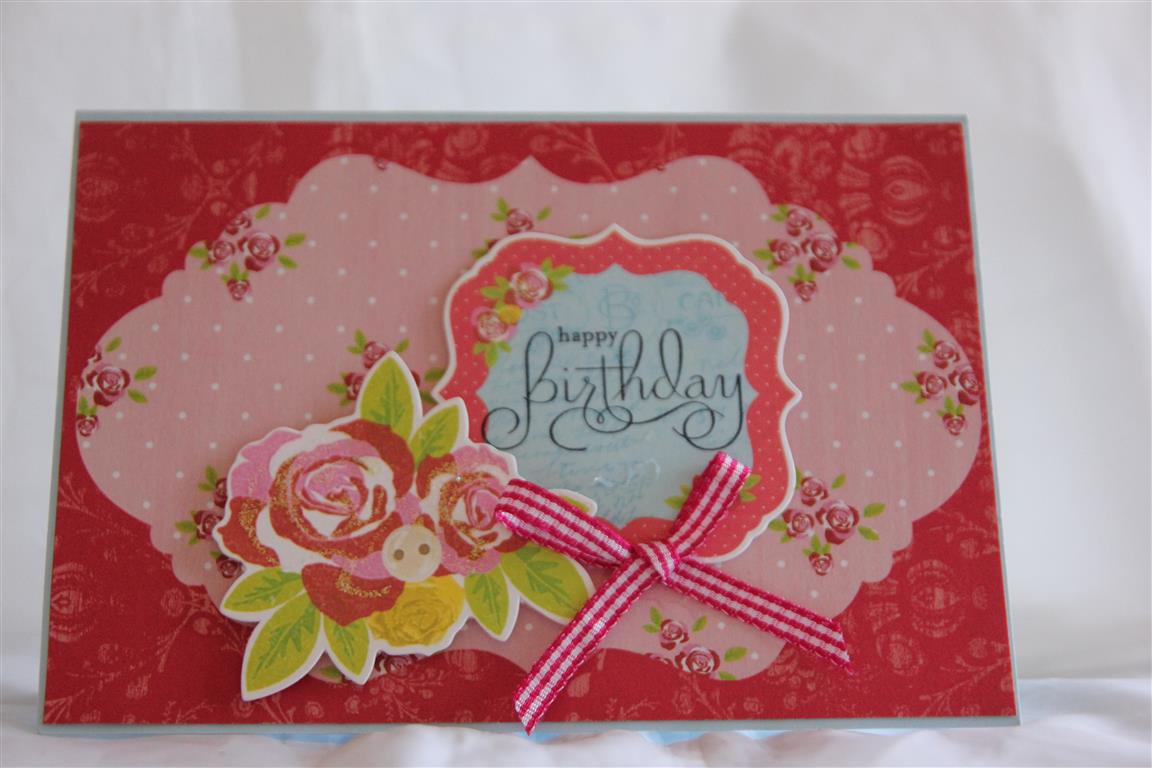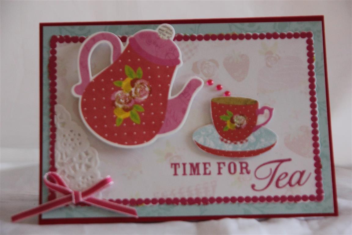 Very quick post tonight as tea is cooking as we speak! This is the last of our Kaisercraft tea Break collection, and here I have used the paper pad . I die cut the shape of the card with a die from Stampin Up – the name escapes me for the moment – I was over at my sisters place and she had it, so I did a fair amount of die cutting with it while I was there!it’s a very effective die and I have made a lot of mens cards with it , which I am sure we will get to at some stage!By then I may know the name of it. A big box arrivced in the post today, so after tea I will have great enjoyment going through it all – I bought a lucky dip from Prima so it’s filled with lots of papers, flowers and assorted embellishments… ah bliss…. Til tomorrow….