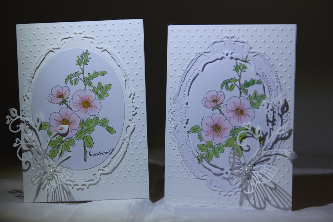 In between playing with paper I like to do a bit of stamping and colouring.The stamp I used on these cards is from stampin Up – Sweet Briar rose. I coloured it with Prisma colour pencils, and kept the rest of the cards white. I used a few different dies – spellbinders Opulent ovals,magnolia flourish and Memory box Kaliadescope butterfly. Added a few white pearls to the butterflies, and layered it all on a piece of cardstock embossed with cuttlebug swiss dots folder.Til tomorrow…