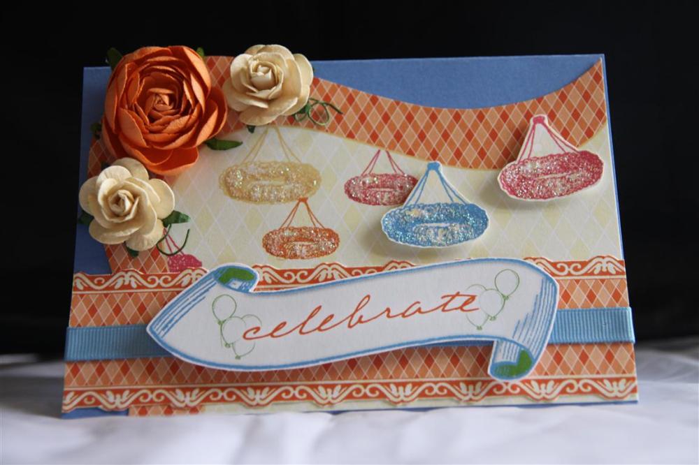 Today is the end of the working week for me, and I am so looking forward to 2 days off and some time to sit and create, as I haven’t done much this week. Tonight I will finish off a couple of Baby cards i started, and then play with my new stampin up goodies. Tonights card is made with papers from Websters pages new range – Lets celebrate. Added to the card is a bit of ribbon, and assorted flowers. I did some fussy cutting of the papers, and added a bit of kindyglitz. The cardstock is stampin up. Til tomorrow….