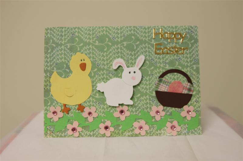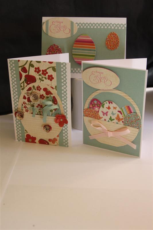 Todays cards are the 3 cards my ladies made in my class on Friday. We used white cardstock, and bazill cardstock, some edges punched with a martha stewart punch.The easter Eggs were cut from a piece of Kaisercraft Bubblegums hills paper, and the floral strip and baskets were cut from a piece of Kaisercraft Nanna’s Kitchen.The baskets were run through a crimper. we also used a Stampin up greeting stamp – Well Scripted, and a little piece of ribbon.I’m back in the craft room today making more Mothers day cards but I can see light at the end of the tunnel, and think I will soon be able to move onto something different! Til tomorrow…..