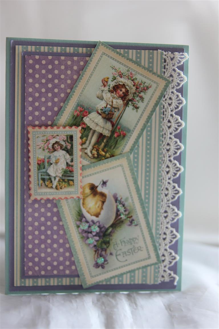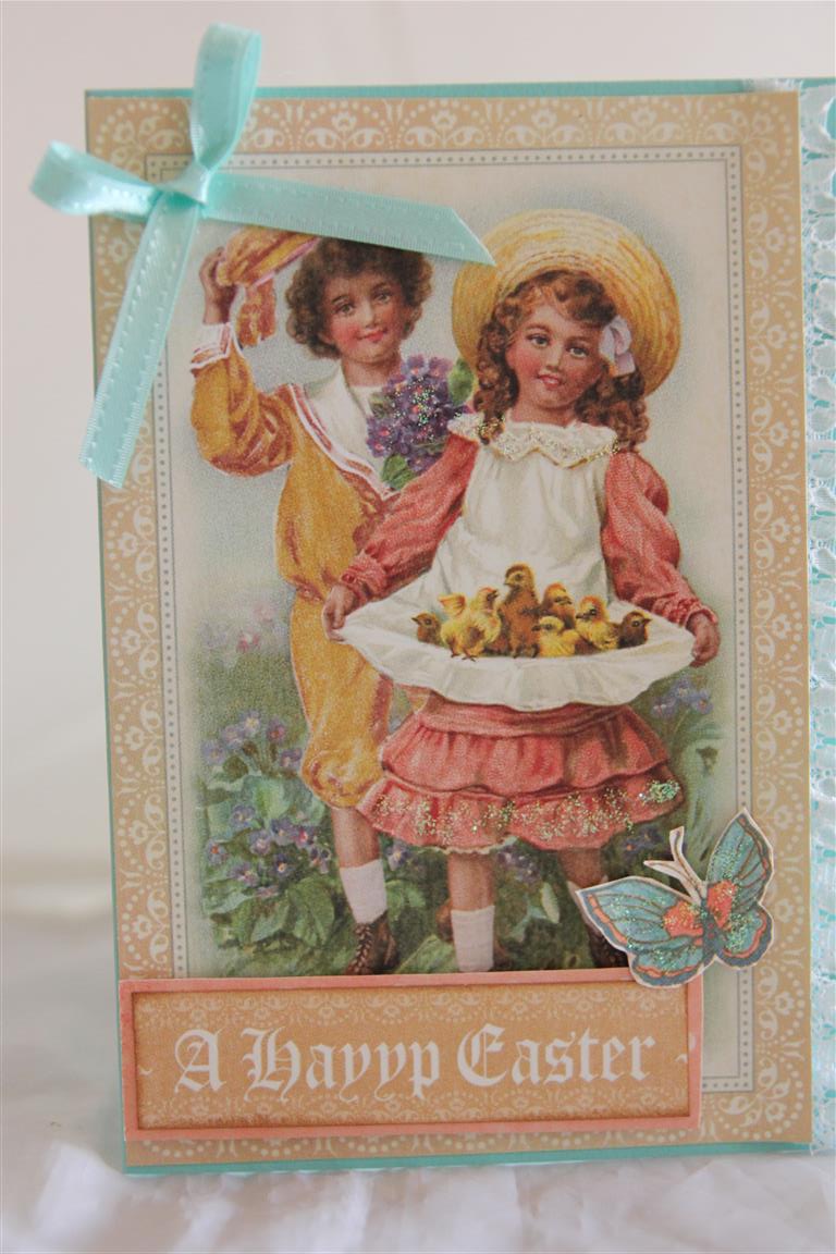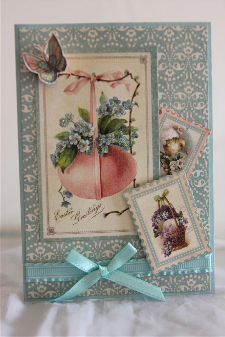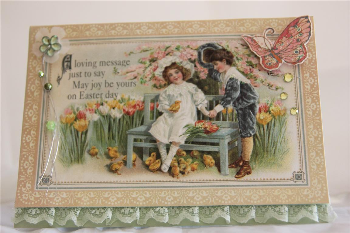 As the Easter eggs find their way to our shop shelves, it is time to post a few easter cards i ahve made with graphic 45 Sweet sentiments paper collection. An easy one this one – the image is all one piece from a piece of the 12 x 12 paper, and I just added lace and rhinestones. The butterfly was fussy cut from another piece of the paper collection. off out tonight to investigate the adelaide fringe festival, so til tomorrow…..