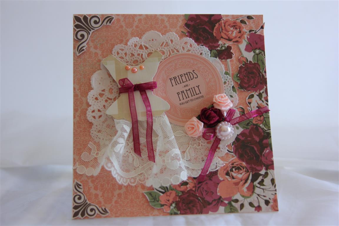 A totally different card today compared to yesterdays clean and simple design! This is a card I made for our card club.The background paper is from the Kaisercraft Lady Rose 6″ pad, and I fussy cut all the flowers around the edges from another sheet from the same pad. I lightly inked the doily and added some of the matching collectables. I drew the bodice ( the paper there is a scrap of websters pages) added some lace for the skirt, and them embellished with flowers,pearls and ribbon. I had great fun creating this one – didn’t think too much about it – just cut and stuck! I have a couple of orders to do this weekend,then lots of new kaisercraft papert to play with – can’t wait!til tomorrow…..