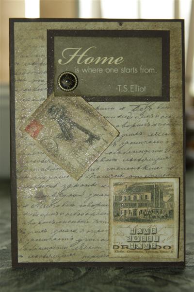 Tonights card uses Stampin Up cardstock (early espresso- this is fast becoming a favourite colour), and the background paper is Kaisercraft Undercover from the Secret Bird society patterned paper range. The greeting is from Inique Boutiique patterned papers, and the key and house images are from K&Co Lifes Journey stamp collage embossed paper. The gorgeous brad is from stampin up. There is a little glimmer mist (old mist) sprayed on the card. I am suffering from a bad back just now, so not much card making happening this week so far which is frustrating as I still haven’t made my own xmas cards yet!Oh well, til tomorrow….
