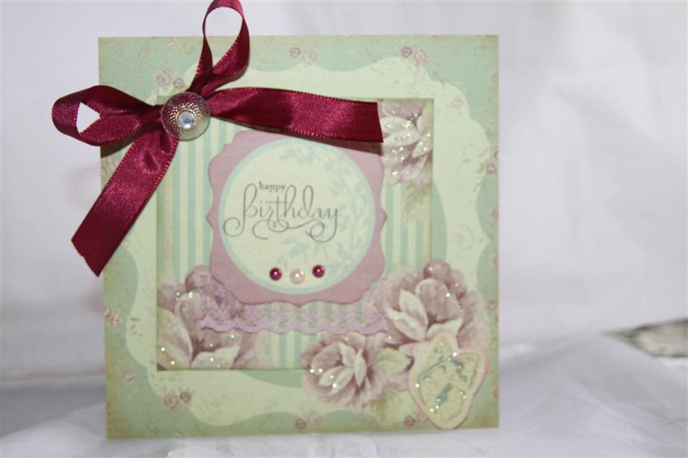 Straight off I want to say that I found this paper a challenge – it is very pretty, but the muted colours are not what I usually choose, but learning is all about stretching yourself, so I will share my creations with you! I did make an initial 4 cards with this paper which sold before I could photo them, so some people do like this colourway. The paper is Kaisercraft Magnolia Grove, and I have also used the matching collectables, some kaisercraft pearls, lace, ribbon and websters pages clear rhine sparkler. The papers used on this one are all cut from 12 x 12 sheets. Til tomorrow….