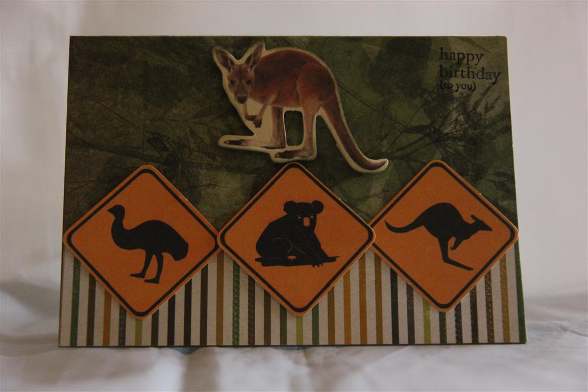 This photo is a little dark – in real life the background isn’t quite so dark, the paper is from Kaisercrafts Great Southern Land collection and I used the matching collectables as well. This was a release in the second half of last year, but it should still ba available. I used it for a class last september, and we all thought it would be good for xmas cards to send overseas.this one though I have made into a birthday card stamping a stampin up sentiment stamp straight onto the paper.I will be found in the craft room tonight as I have a few orders to make including quite a few wedding cards! Til tomorrow….