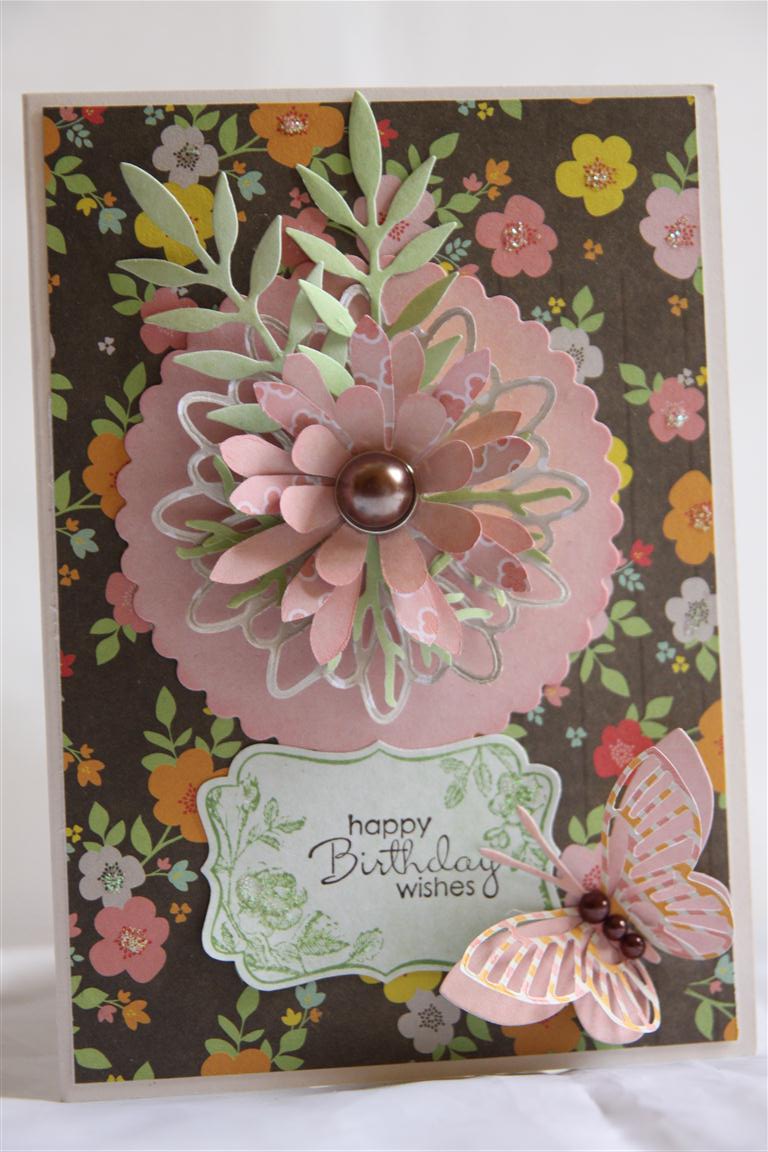 I still have a couple of my prima meadow lark series to show but we will get back to them. Today ( and tomorrow) I wanted to show the final few cards I made with the last of my American crafts Neapolitan paper collection. For those that have been following you will remember that I used it in my scarp series. I had just a little left over and so decided to finish the bits and pieces left. Altogether I made 19 cards out of my 4 sheets of paper which I was quite surprised about. So, todays card made using a variety of dies and my cuttlebug and American crafts Neapolitan paper, and a list of dies – Moonlight butterfly, kaliedoscope butterfly, amani circle, meadow leaf ( all by memory box) spellbinders scalloped circles, and Stampin Up Party Blossom . The sentiment was all Stampin Up products – Decorative label punch,Four frames stamp set and petite pairs stamp set. Speaking of which my siser Kay brought me some new products this morning and I have had a great afternoon inking ,stamping , colouring and die cutting – the best way to spend an afternoon! Til tomorrow….