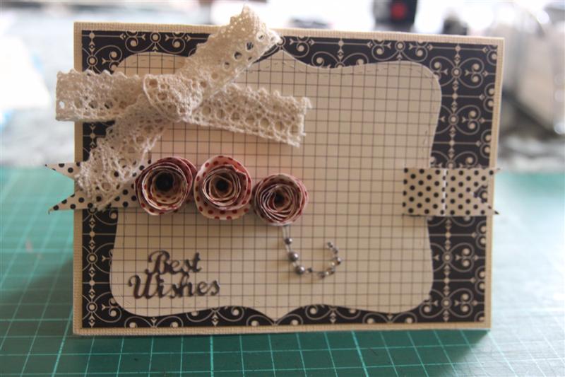 Tonights card uses beige bazzill cardstock for the base, and then features Stampin Up Love letters designer papers. I used the Stampin Up top note die, some lace and bling, and the flowers were made by cutting circles into spirals and rolling them up. I threaded some more paper through two slits I made in the top note die cut for added interest. Til tomorrow…..