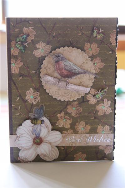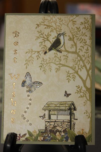 I have made this card using Websters Pages (my favourite at the moment) Natures storybook, stampin up cardstock – mellow moss, which matches exactly, love when that happens ! some kaisercraft pearls,a little fussy cutting for the butterfly and the bird, and a best wishes stamp gold embossed ! Too easy!