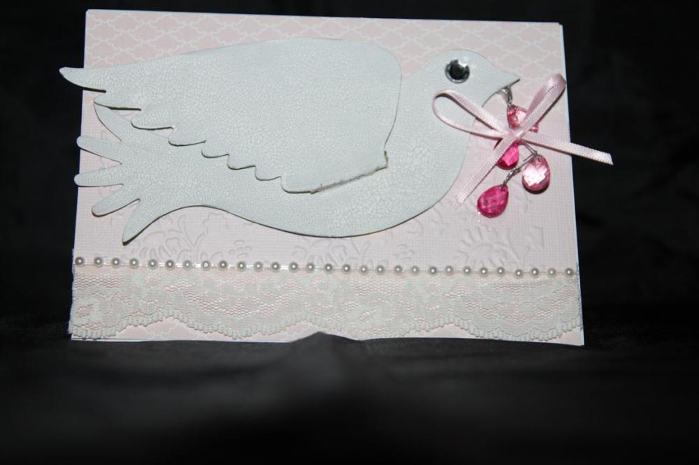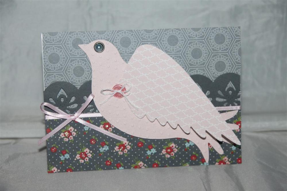 This is the other card I made with my new Stampin Up Elegant Bird die. I cut this one out of an old cornflakes box, as I wanted a strong base for the crackle paint which I painted over the whole of the bird and wing and left over night to dry. It doesn’t show too well in the photo, but as the paint dries you get a lovely crackled effect.The background paper is from Stampin Up Twitterpated range, and I ran some pink Bazzil through the cuttlebug with my Craft Conceptes cottage floral embossing folder. I just had to add some lace, ribbon, Magnolia chandelier garland, and a strip of kaisercraft pearls.Had a lovely morning with my ladies,then this afternoon a short time in the craft room where I have been working with Kaisercrafts new release, but I am afraid my mind rebelled, and I found myself packing away the muted tones and digging out my brightest ribbons and buttons and papers to come up with some very bright and sunny cards, which we will photo next week when I am on Holiday ( Yay…) Til tomorrow….