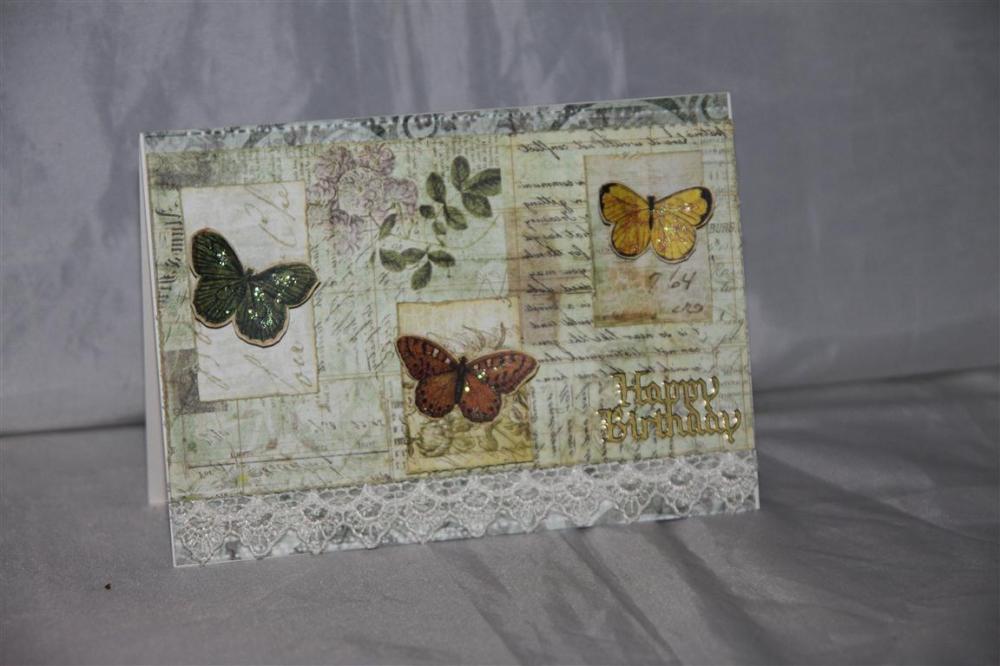 I have mixed and matched a little bit on this card.The papers are all Prima paper, there are two main layers, and the one most visible is Prima Botanical paper. I cut rectangles from more prima paper, and distressed and sponged all my edges. The butterflies were cut from a sheet of graphic 45 paper which was a full sheet of gorgeous butterfly images which are now all fussy cut and waiting to be put on more cards! I just added a little lace and kindyglitz.I have now officially started my 4 weeks holidays, and I am so looking forward to all the crafty things I have planned! Til tomorrow….
