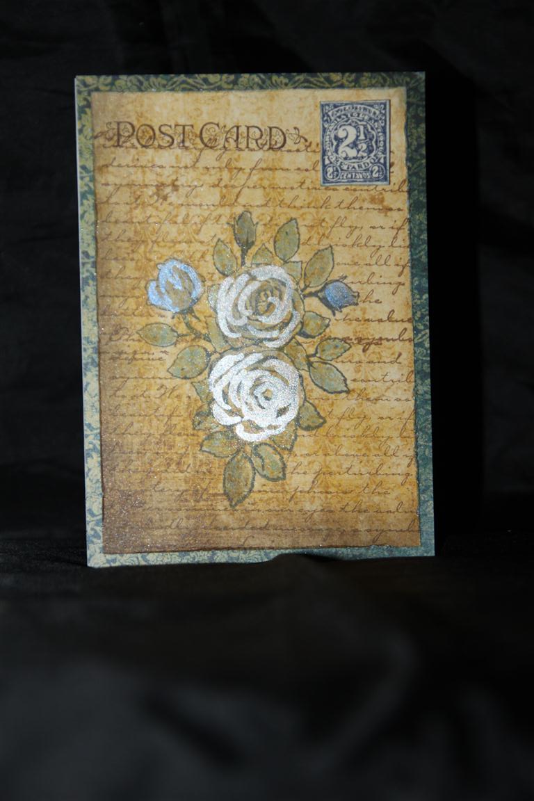 Yesterday i showed you 3 cards simply stamped and coloured with my Kaisercraft English Rose stamp. Today I am showing you what happened next with the same stamp – I stepped it up a little and did some “what ifs” so – the papers I used were Bo Bunny Weekend market, and I stamped a script stamp ( Stamp It Butterfly script but any would do) across the whole of the beige coloured patterned paper. I stamped Post Card across the top ( Prima stamp) and stamped a stamp ( My minds eye Rosy Everything set) onto cardstock, cut it out and stuck it on the corner. You will also notice that I mix and match my stamp sets – just cos they come in the same packet doesn’t mean you can only use them together!Now I stamped my English Rose on the centre of the card and coloured it with my little pots of perfect pearls powder. For those of you following closely ( and I know there are a few of you because I have had e-mails asking about colouring my images, and so I am putting together a short video stepping out the methods I use)the way I did this – I hand coloured my image with a Versamark pen, and then used a paintbrush to paint the powder on. The beauty with this technique is you don’t have to be perfect – the powder only sticks to where the versamark pen has been.And the flowers have a glorious shine to them!Today I have made great inroads on the male card front and have lots to photo for future blogs! Til tomorrow…..