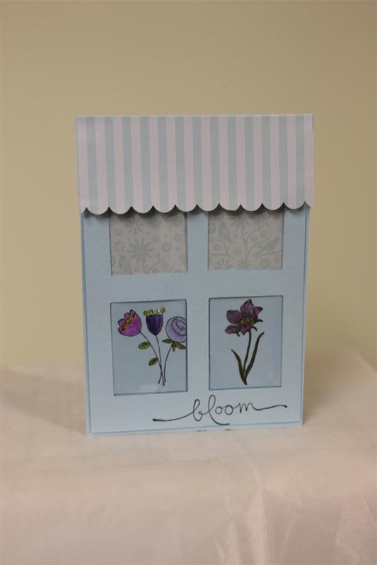 Shop 2 in my series is the Florist. The canopy paper is from The little cake shop range from docrafts, and the patterned background paper in the top windows is from Papermania. I used stampin up cardstock – bashful Blue,and assorted stampin up stamps for the flowers . The name of the shop (Bloom) is also a stampin up stamp Another shop tomorrow! Til then…..