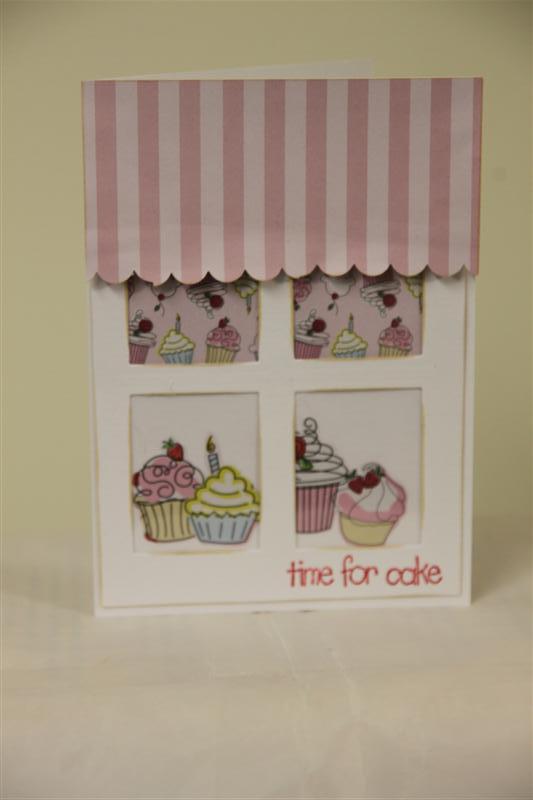 The name of this paper collection inspired the card, and I didn’t stop at one shop – I made a whole street! Over the next few days you will be welcomed into my shoe shop, flower shop etc etc…. I used Docrafts paper – The little cake shop, white card, and acetate for the windows. I cut the windows with my rectangle nestabilities, and that was the trickiest bit, making sure the windows lined up. I fussy cut the cakes from the paper for the lower windows. I had great fun making these cards, I hope you like them! Til tomorrow…..