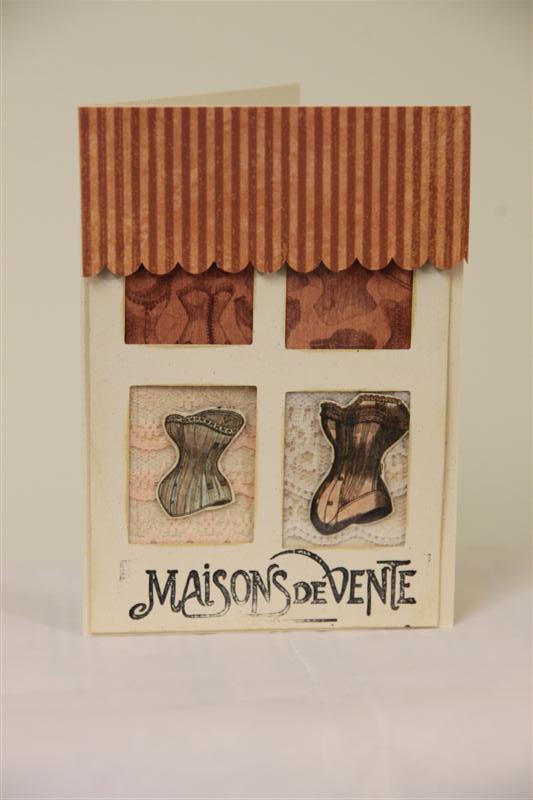Shop 3 is a corsetry shop – all good main streets should have one! I used Graphic 45 Steampunk debutante paper, and Oxford impressions stamps – Corsetry – and I placed a little lace behind the lower windows. As with all the shops, there is acetate for the window glass. I’ve been busy creating in my room today, and will have to get my photographer on the job now to take some photos. Til tomorrow…..