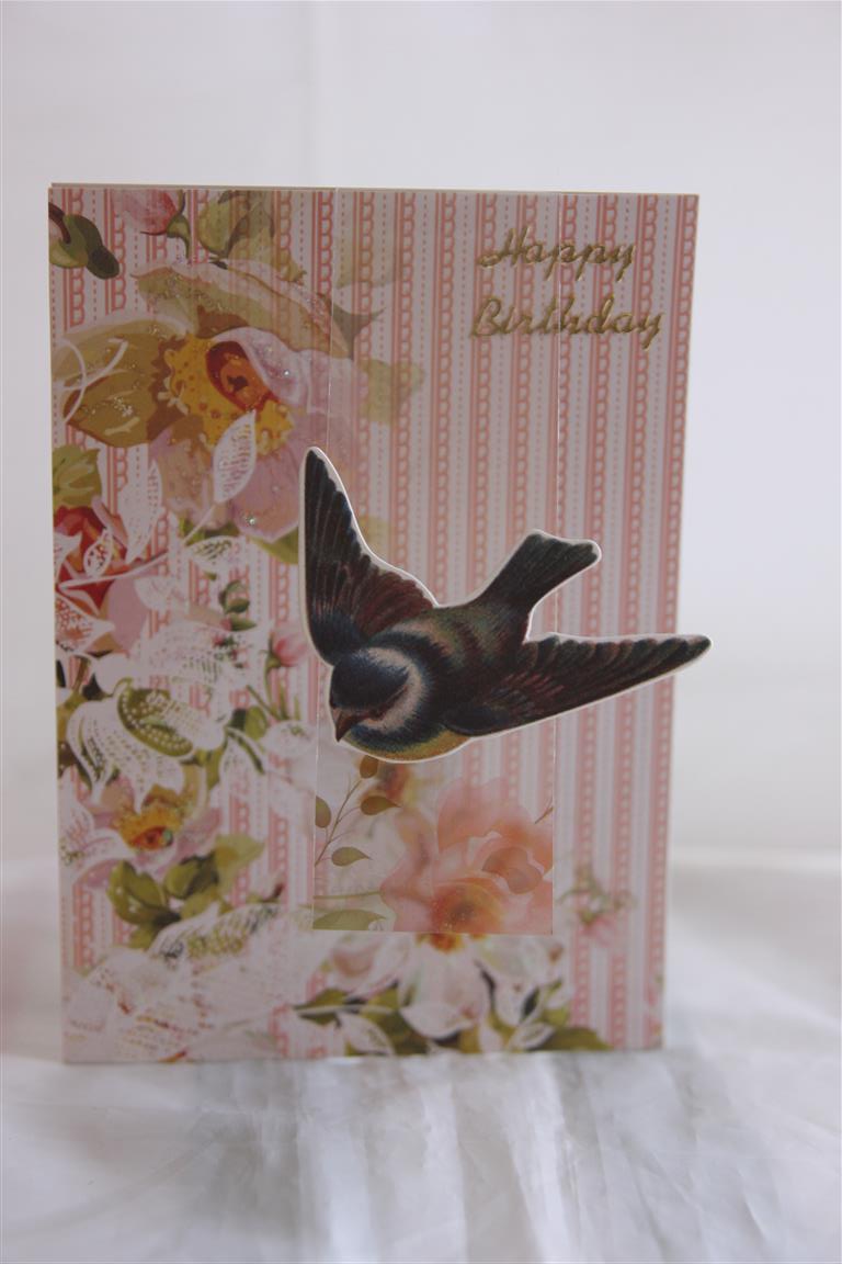 This card is a little different… although it doesn’t show up too well in the photo the bird on the front is actually swinging on a strip of acetate. I sandwiched the acetate between the card front and the patterned paper. The paper is from the Kaisercraft Porcelain Rose 6″pad and the bird is from the matching collectables.I really liked this effect and will be doing it more often – I can see it working for male themed cards with a plane flying by, or kids cards with balloons or kites …We lots of cards to photo this weekend, but have realised I have been a bit naughty and made all these cards without the inserts, so tonight i will be busy making inserts..sigh…Til tomorrow….