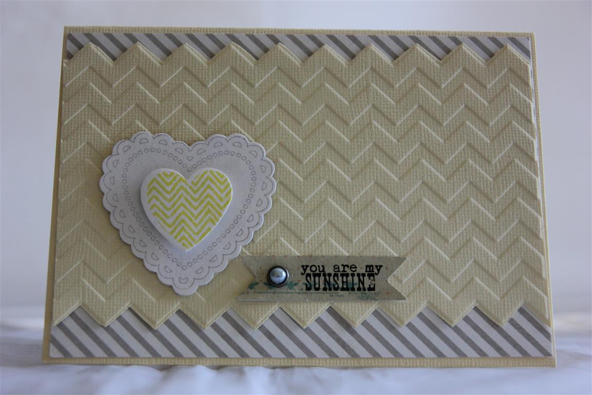 Still with the whole Yellow and grey theme – this time I used the hearts in the Hearts a flutter stamp set and die set from Stampin Up and also the Chevron embossing folder from stampin up. The cardstock is Kiasercraft – Kaisercard, and the patterned paper and the tag are from My Minds Eye.Back to work for me today, so a lazy night in front of the tv is on the cards tonight! Til tomorrow….