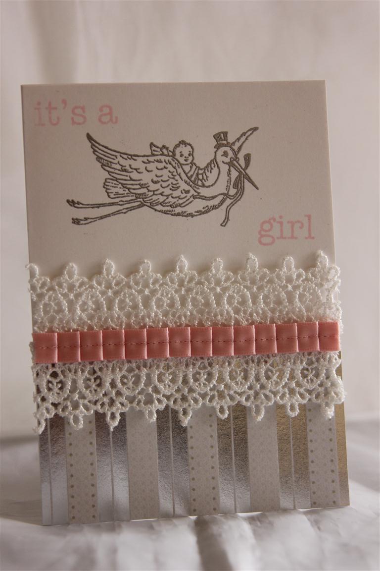 I made this card for a challenge that we run each month at the craft chop I teach at. The challenge was to use this silver embossed paper on a card with the theme wings and things ( It’s from kaisercraft After Five range) and I made a few different cards using it. For this one I used a stampin Up stamp – Bringing Baby and silver embossed the image. The words are from another stampin Up set – baby Prints,as is the pink ruffled ribbon. I love the extra wide lace under the ribbon – I picked it up at a haberdashery store.back at work today, long hours for the next 3 days, so no crafting for me tonight! Til tomorrow….